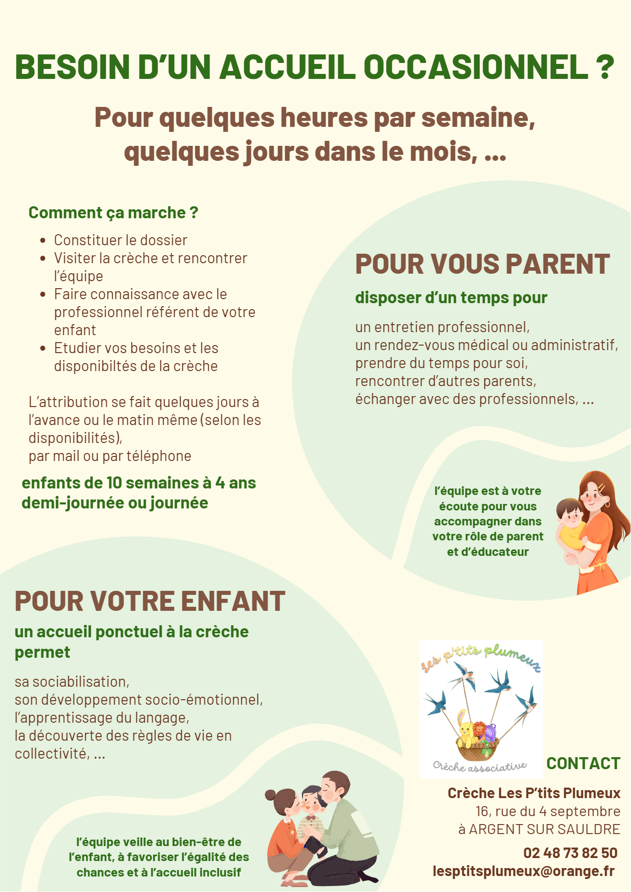 Vous êtes parent d’un enfant de moins de 3 ans et vous cherchez un mode de garde complémentaire, régulier ou occasionnel, la crèche Les P’tits Plumeux a peut-être la réponse à vos besoins.